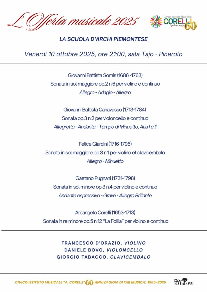Un omaggio alla Scuola d’archi piemontese del settecento, che annovera importanti compositori (Somis, Pugnani, Giardini, Canavasso) che alla loro epoca furono considerati dei veri e propri capiscuola e furono acclamati come solisti presso le più importanti corti europee: Parigi, Londra, Sanpietroburgo. Un omaggio alla scuola d’archi piemontese del settecento, che annovera importanti compositori (Somis, Pugnani, Giardini, Canavasso) che alla loro epoca furono considerati dei veri e propri capiscuola e furono acclamati come solisti presso le più importanti corti europee, Parigi, Londra, Sanpietroburgo.