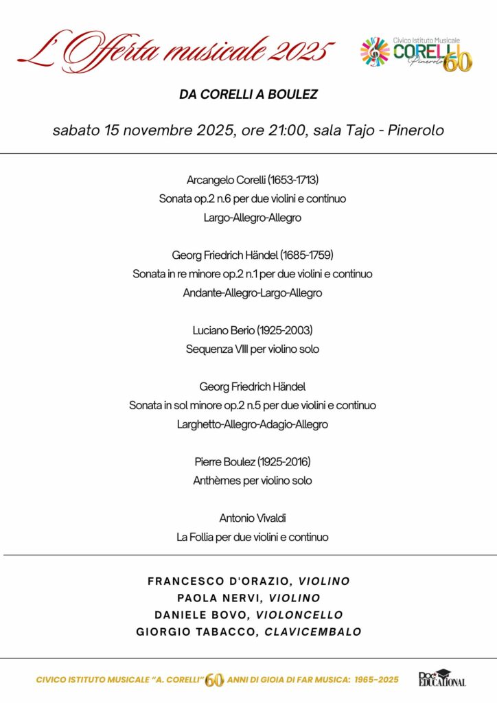 Riparte la stagione concertistica “L’Offerta Musicale 2025” a cura del Civico Istituto Musicale A. Corelli di Pinerolo.